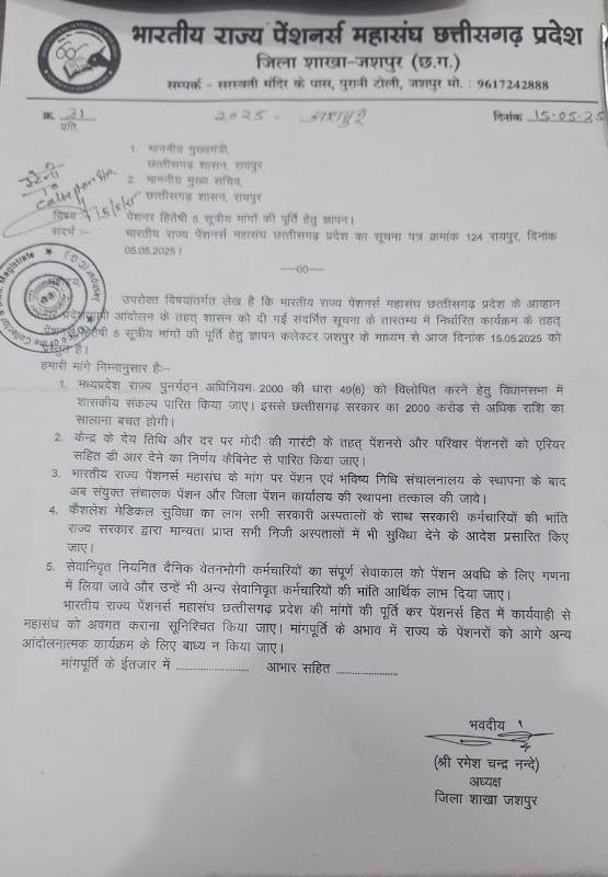 जशपुर, 15 मई 2025 : राज्य के सेवानिवृत्त कर्मचारियों एवं पेंशनरों की समस्याओं को लेकर भारतीय राज्य पेंशनर्स महासंघ, छत्तीसगढ़ प्रदेश की जिला शाखा जशपुर द्वारा आज एक 6 सूत्रीय ज्ञापन कलेक्टर जशपुर के माध्यम से मुख्यमंत्री, मुख्य सचिव एवं पेंशन विभाग के सचिव को प्रेषित किया गया। महासंघ ने अपनी मांगों में पेंशनरों के हितों से जुड़े महत्वपूर्ण विषयों पर राज्य शासन का ध्यान आकर्षित किया है और शीघ्र कार्रवाई की मांग की है।