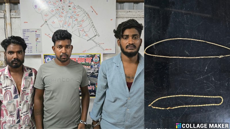 गिरफ्तार आरोपियों में धनागर फोकटपारा कोतरारोड़ निवासी प्रेम सारथी (21), कैदीमुड़ा निवासी गणेश सारथी (26), दरोगापारा निवासी विश्वकर्मा यादव (25) तथा एक विधि के साथ संघर्षरत बालक सम्मिलित हैं। प्रकरण में आरोपियों से दो सोने की चेन कीमत 1,70,000/- रुपए तथा दो बाइक (पल्सर और होंडा शाइन) कीमत करीब 1,80,000/- रुपए कुल 3.50 लाख रुपए की संपत्ति बरामद की गई है।