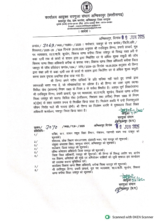 दिनांक 26.05.2025 अनुसार श्री तरसियुस तिग्गा, प्रभारी प्राचार्य, मूल पद व्याख्याता, शा.उ.मा.वि. कुरडेग, विकास खण्ड बगीचा जिला जशपुर के विरूद्ध कक्षा 9वीं से कक्षा 12वीं तक के छात्रों से शासन द्वारा द्वारा निर्धारित दर से अधिक शुल्क वसूली की जाँच विकास खण्ड शिक्षा अधिकारी बगीचा से कराया गया। विकास खण्ड शिक्षा अधिकारी बगीचा जिला जशपुर के जॉच प्रतिवेदन 2024-25 दिनांक 18.08.2024 अनुसार श्री तिग्गा द्वारा कक्षा 9वीं से कक्षा 12वीं तक के छात्रों से शासन द्वारा निर्धारित दर से अधिक शुल्क वसूली करना प्रथम दृष्टया प्रमाणित होना पाया गया है।