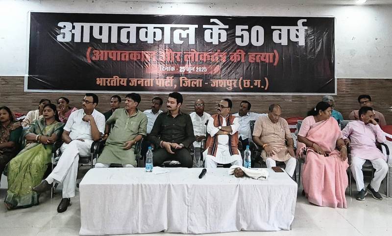 जशपुर. 25 जून 2025 : भारतीय जनता पार्टी ने 25 जून 2025 को आपातकाल की 50वीं बरसी को जशपुर में “संविधान हत्या दिवस” के रूप में मनाया। सनातन धर्मशाला कांसाबेल में आयोजित कार्यक्रम में भाजपा नेताओं ने 1975 के आपातकाल को भारत के लोकतांत्रिक इतिहास का सबसे काला दिन करार दिया। वक्ताओं ने कांग्रेस पर तीखे आरोप लगाते हुए उसे लोकतंत्र, अभिव्यक्ति की आज़ादी और न्याय व्यवस्था का गुनहगार बताया।