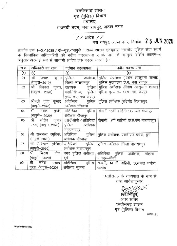 रायपुर, 25 जून 2025। छत्तीसगढ़ शासन के गृह (पुलिस) विभाग द्वारा मंगलवार को भारतीय पुलिस सेवा (आईपीएस) अधिकारियों के बड़े पैमाने पर तबादले किए गए। इस आदेश के तहत कुल नौ आईपीएस अधिकारियों को तत्काल प्रभाव से नवीन पदस्थापना दी गई है। राज्य के पुलिस प्रशासन को सुदृढ़ करने, कार्यक्षमता बढ़ाने और फील्ड स्तर पर बेहतर प्रबंधन सुनिश्चित करने की दृष्टि से यह स्थानांतरण आदेश महत्वपूर्ण माना जा रहा है।