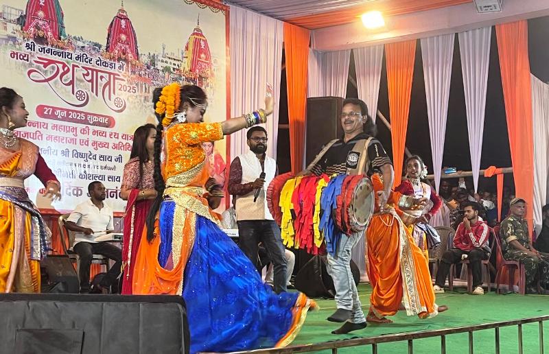 दोकड़ा/कुनकुरी. 30 जून 2025 : श्री जगन्नाथ रथ यात्रा महोत्सव के अंतर्गत दोकड़ा स्थित मौसी बाड़ी प्रांगण में एक भव्य सांस्कृतिक संध्या का आयोजन हुआ, जहां झारखंड के सुप्रसिद्ध लोक कलाकारों और नृत्य समूहों ने लोक संस्कृति, भक्तिरस और मनोरंजन का मनमोहक संगम प्रस्तुत किया। पारंपरिक नागपुरी गीत, मांदर वादन, और बच्चों की जीवंत प्रस्तुतियों ने हजारों श्रद्धालुओं को झूमने पर मजबूर कर दिया। यह आयोजन न सिर्फ भक्ति से ओतप्रोत रहा, बल्कि छत्तीसगढ़-झारखंड की सांस्कृतिक एकता का भी प्रतीक बना।