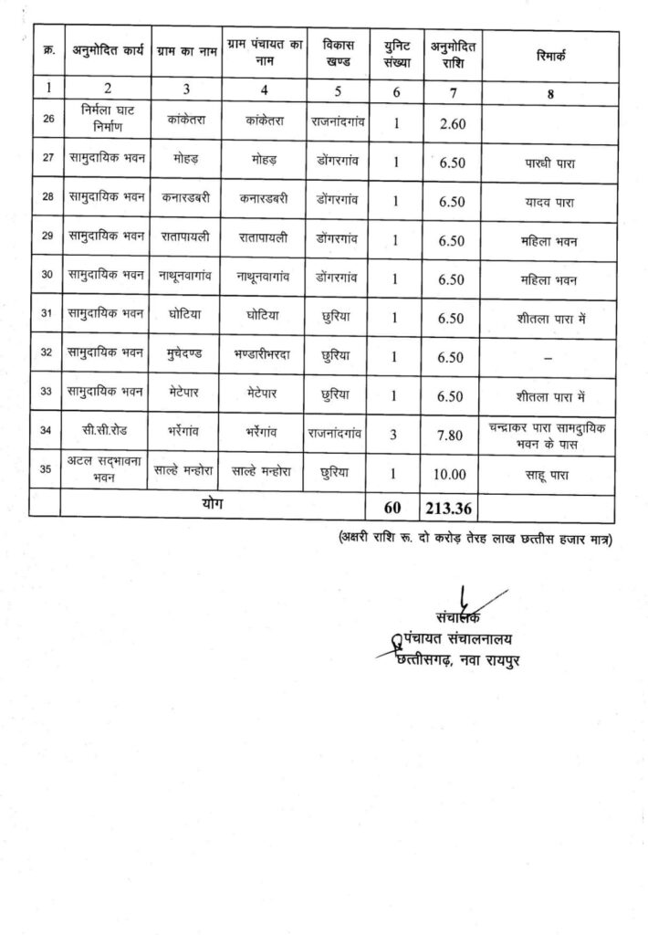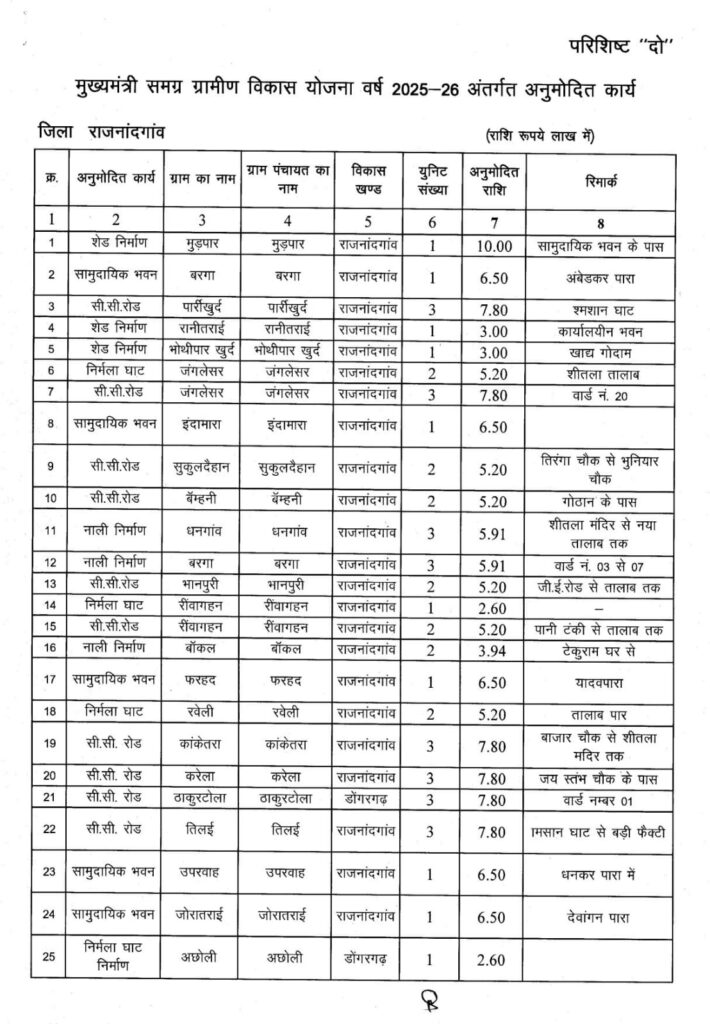 इसमें राजनांदगांव विधानसभा क्षेत्र के 18 ग्रामों के लिए 1 करोड़ से अधिक की राशि स्वीकृत की गई है। इनमे निम्नलिखित विकास कार्य प्रस्तावित हैं: ग्राम मुड़पार में 10 लाख, रानीतराई एवं भोथीपार खुर्द में 3 लाख की लागत से शेड निर्माण। ग्राम बरगा, इंदामारा, फरहद में 6.5 लाख की लागत से सामुदायिक भवन निर्माण। ग्राम पार्रीखुर्द एवं जंगलेसर में 7.80 लाख की लागत से और ग्राम सुकुलदैहान, बम्हनी, भानपुरी व रीवागहन में 5.20 लाख की लागत से सीसी रोड निर्माण। ग्राम जंगलेसर, रीवागहन व रवेली में 5.20 लाख की लागत से निर्मला घाट निर्माण के साथ ग्राम धनगांव व बरगा में 5.91 लाख, ग्राम बॉकल में 3.94 लाख की लागत से नाली निर्माण का कार्य किया जायेगा।
