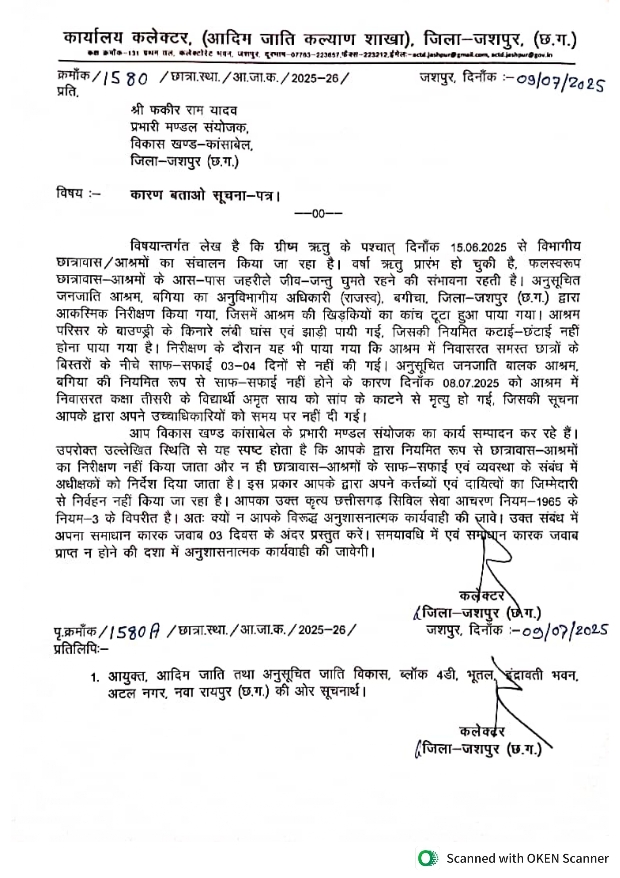 जशपुर 10 जुलाई 2025/ कलेक्टर रोहित व्यास ने फकीर राम यादव प्रभारी मण्डल संयोजक, विकास खण्ड-कांसाबेल, जिला-जशपुर (छ.ग.) को कारण बताओ सूचना पत्र जारी किया।