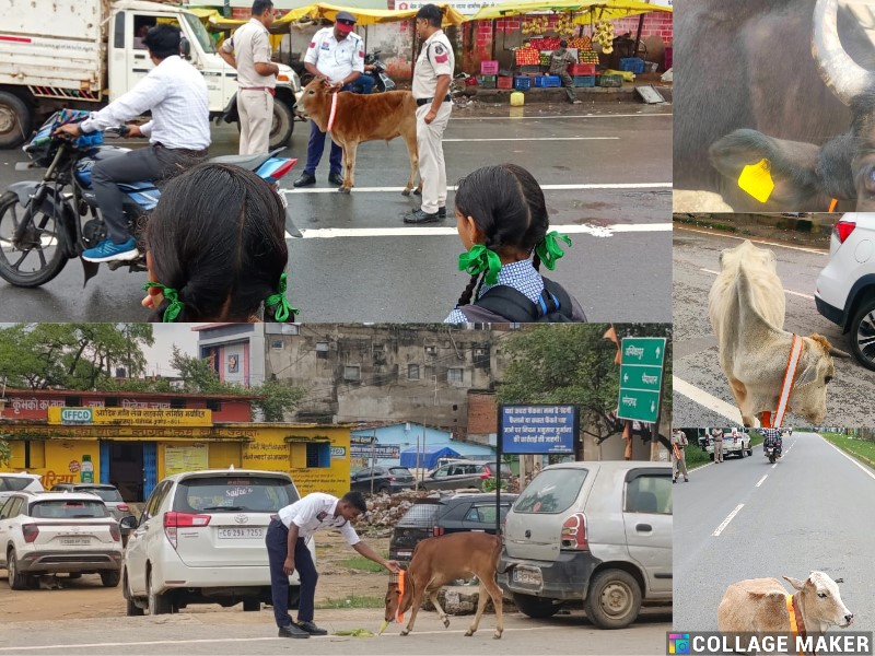 रेडियम कॉलर रोकेगा सड़क हादसे, यातायात पुलिस ने मवेशियों के गले में पहनाया सुरक्षा पट्टा रेडियम कॉलर.