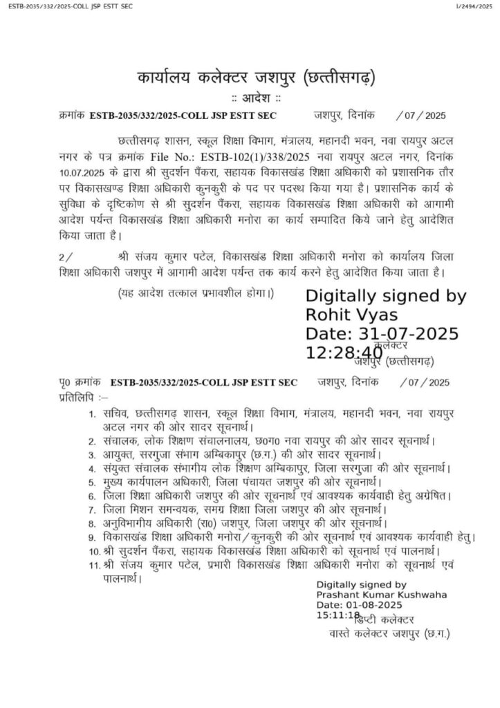 जशपुर. 2 अगस्त 2025 : जिले में शिक्षा विभाग के अंतर्गत एक और प्रशासनिक फेरबदल किया गया है। कलेक्टर श्री रोहित व्यास ने आदेश जारी कर सहायक विकासखंड शिक्षा अधिकारी सुदर्शन पैंकरा को मनोरा विकासखंड शिक्षा अधिकारी (बीईओ) का अतिरिक्त प्रभार सौंपा है। वहीं वर्तमान बीईओ श्री संजय कुमार पटेल को जिला शिक्षा अधिकारी कार्यालय, जशपुर में आगामी आदेश तक कार्य करने के लिए निर्देशित किया गया है। यह आदेश तत्काल प्रभाव से लागू कर दिया गया है।