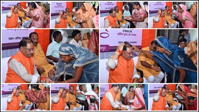 जशपुर, 9 अगस्त 2025/ मुख्यमंत्री विष्णु देव साय के गृह ग्राम बगिया कैम्प कार्यालय में रक्षाबंधन के पावन पर्व पर विभिन्न योजनाओं से लाभान्वित दीदीयों ने राखी बांधकर आभार व्यक्त किया।