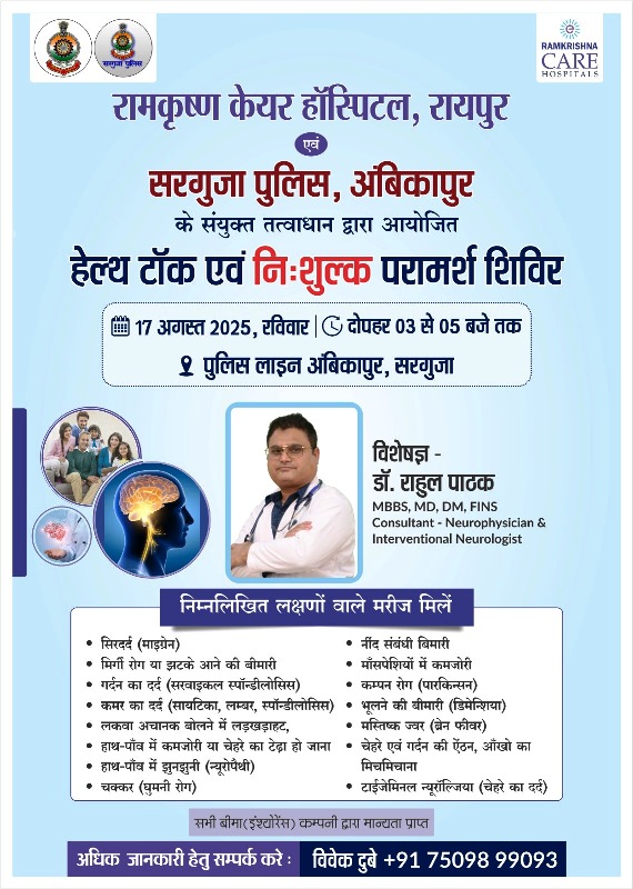 जिले में पदस्थ पुलिस अधिकारी/कर्मचारियों एवं उनके परिवारों के सदस्यों के लिए वरिष्ठ पुलिस अधीक्षक सरगुजा श्री राजेश अग्रवाल (भा.पु.से.) के दिशा निर्देशन में सरगुजा पुलिस एवं रामकृष्ण केयर हॉस्पिटल रायपुर के संयुक्त तत्वाधान में आयोजित पुलिस वेलफेयर से नि:शुल्क हेल्थ टॉक एवं परामर्श शिविर का सुव्यवस्थित सकारात्मक आयोजन रक्षित केन्द्र अम्बिकापुर में दिनांक 17 अगस्त 2025 (दिन रविवार) को (समय दोपहर 03:00 बजे से 05:00 बजे तक) किया जाना प्रस्तावित है। उपरोक्त शिविर में रामकृष्ण केयर हॉस्पिटल रायपुर से डॉ. राहुल पाठक न्यूरोफिजिशियन एंड इंटरवेंशनल न्यूरोलोजिस्ट स्पेशलिस्ट उपस्थित होकर अपनी सेवाएँ प्रदान करेंगे।