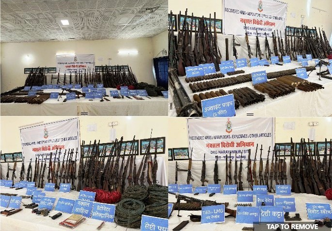 नक्सल विरोधी अभियान में बरामद सामग्री – 01. 7.62 mm LMG मय मैग्जीन – 01 नग, 02. 51 mm मोटार्र- 01 नग, 03. टिर्ची असाल्ट रायफल मय मैग्जीन 01 नग, 04. 7.62 mm एसएलआर.- 01 नग, 05. 5.56 mm इंसास मय मैग्जीन -01 नग, 06. स्टेन गन मय मैग्जीन – 01 नग, 07. 9mm पिस्टल मय मैग्जीन – 02 नग, 08. देशी कट्टा – 02 नग, 09. 315 का जिंदा कारतूस – 10 राउण्ड, 10. बीजीएल लांचर – 08 नग, 11. 303 रायफल – 03 नग, 12. 303 बट ब्रोकन – 01 नग, 13. 12 बोर – 04 नग, 14. 12 बोर बैरल – 08 नग, 15. भरमार बंदूक – 49 नग, 16. बीजीएल सेल बड़ा – 23 नग, 17. बीजीएल सेल मीडियम – 63 नग, 18. बीजीएल सेल छोटा -14 नग, 19. देशी हैण्ड ग्रेनेड- 08 नग, 20. हैण्ड ग्रेनेड – 01 नग, 21. तीर बम ब्रोकन – 08 नग, 22. कार्डेक्स वायर लाल रंग – 02 बंडल, 23. सेप्टी फ्युज – 141 बंडल, 24. 3ज्वाइंट पाइप 5 फीट 01 सेट, 25. गार्मीन जीपीएस – 01 नग, 26. गोल प्लेट- 16 नग, 27. डेटोनेटर इलेक्ट्रानिक – 05 नग, 28. फोर व्हीलर रिमोट स्वीच -02 बैटरी, स्वीच – 04 नग, 29. नक्सल साहित्य.