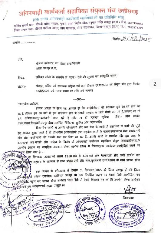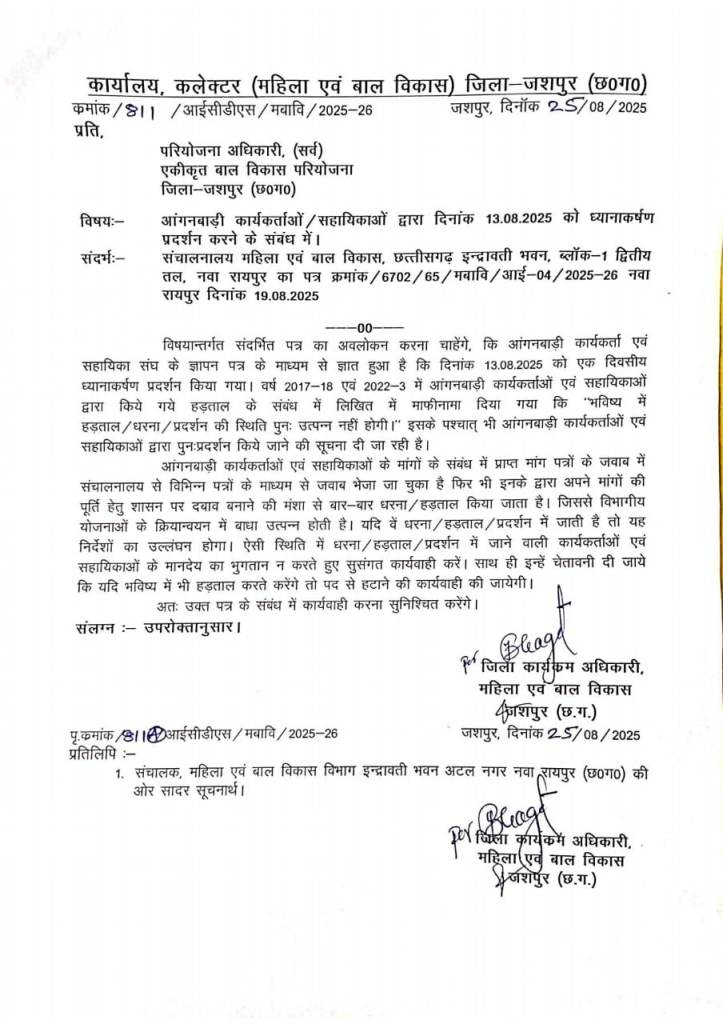 जशपुर, 30 अगस्त 2025 : आगामी एक सितंबर को सामूहिक अवकाश ले एक दिवसीय हड़ताल करने की सूचना दिए जाने के साथ ही आंगनबाड़ी कार्यकर्ताओं और सहायिकाओं को शासन के निर्देश पर विभाग प्रमुखों के द्वारा हड़ताल में शामिल होने पर मानदेय में कटौती और बार- बार हड़ताल किए जाने पर बर्खास्त किए जाने की चेतावनी दी गई है।