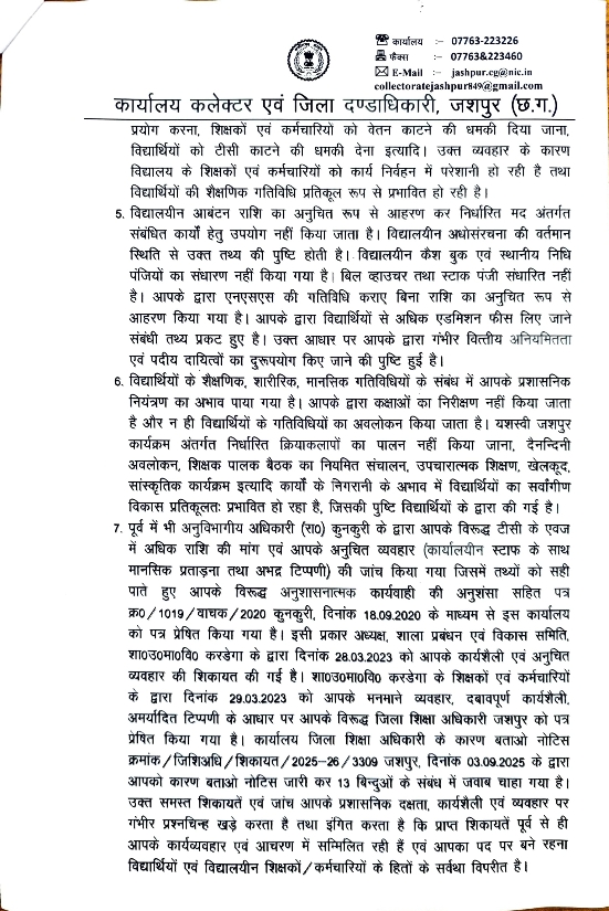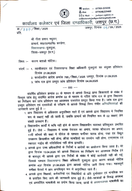 विद्यार्थियों के शैक्षणिक, शारीरिक, मानसिक गतिविधियों के संबंध में प्राचार्य श्री गीता प्रसाद मधुकर प्रशासनिक नियंत्रण का अभाव पाया गया है।उनके द्वारा कक्षाओं का निरीक्षण नहीं किया जाता है और न ही विद्यार्थियों के गतिविधियों का अवलोकन किया जाता है। यशस्वी जशपुर कार्यक्रम अंतर्गत निर्धारित क्रियाकलापों का पालन नहीं किया जाना, दैनन्दिनी अवलोकन, शिक्षक पालक बैठक का नियमित संचालन, उपचारात्मक शिक्षण, खेलकूद, सांस्कृतिक कार्यक्रम इत्यादि कार्यों के निगरानी के अभाव में विद्यार्थियों का सर्वांगीण विकास प्रतिकूलतः प्रभावित हो रहा है, जिसकी पुष्टि विद्यार्थियों के द्वारा की गई है। पूर्व में भी अनुविभागीय अधिकारी (रा०) कुनकुरी के द्वारा प्राचार्य श्री गीता प्रसाद मधुकर के विरूद्ध टीसी के एवज में अधिक राशि की मांग एवं आपके अनुचित व्यवहार कार्यालयीन स्टाफ के साथ मानसिक प्रताड़ना तथा अभद्र टिप्पणी की जांच किया गया जिसमें तथ्यों को सही पाते हुए उनके विरूद्ध अनुशासनात्मक कार्यवाही की अनुशंसा सहित पत्र कार्यालय को पत्र प्रेषित किया गया है। इसी प्रकार अध्यक्ष, शाला प्रबंधन एवं विकास समिति, शा०उ०मा०वि० करडेगा के द्वारा दिनांक 28 मार्च.2023 को उनके कार्यशैली एवं अनुचित व्यवहार की शिकायत की गई है। शा० उ०मा०वि० करडेगा के शिक्षकों एवं कर्मचारियों के द्वारा 29 मार्च 2023 को उनके मनमाने व्यवहार, दबावपूर्ण कार्यशैली. अमर्यादित टिप्पणी के आधार पर उनके विरूद्ध जिला शिक्षा अधिकारी जशपुर को पत्र प्रेषित किया गया है। कार्यालय जिला शिक्षा अधिकारी के कारण बताओ नोटिस 03 मार्च 2025 को जारी कर 13 बिन्दुओं के संबंध में जवाब चाहा गया है। उक्त समस्त शिकायतें एवं जांच प्रशासनिक दक्षता, कार्यशैली एवं व्यवहार पर गंभीर प्रश्नचिन्ह खड़े करता है तथा इंगित करता है कि प्राप्त शिकायतें पूर्व से ही प्राचार्य श्री गीता प्रसाद मधुकर के कार्यव्यवहार एवं आचरण में सम्मिलित रही हैं एवं उनका पद पर बने रहना विद्यार्थियों एवं विद्यालयीन शिक्षकों व कर्मचारियों के हितों के सर्वथा विपरीत है। उक्त बिन्दुओं के आधार पर क्यों न उनके विरूद्ध छ०ग० सिविल सेवा आचरण नियम 1965 के प्रावधानानुसार अनुशासनात्मक कार्यवाही प्रस्तावित की जावे? इस संबंध में न्यायोचित लिखित जवाब 03 दिवस के भीतर समक्ष स्वतः उपस्थित होकर प्रस्तुत करने हेतु नोटिस जारी किया गया है। समयावधि में समाधानकारक जवाब प्रस्तुत नहीं करने की स्थिति में प्राचार्य गीता प्रसाद मधुकर के विरूद्ध एकपक्षीय कार्यवाही की जावेगी, जिसकी संपूर्ण जिम्मेदारी उनकी होगी।