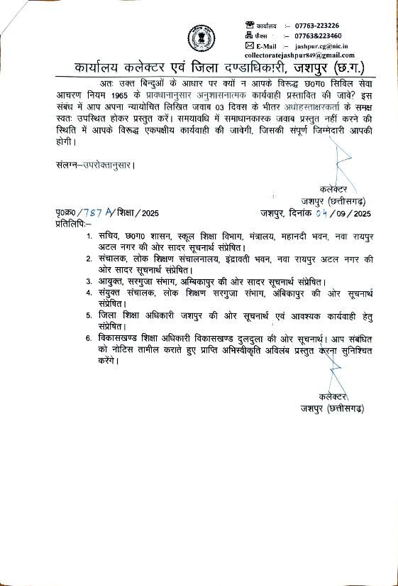 जशपुर, 05 सितम्बर 2025/ कलेक्टर रोहित व्यास ने शा.उ.मा.वि. करडेगा के प्राचार्य गीता प्रसाद मधुकर कारण बताओ नोटिस जारी कर न्यायोचित लिखित जवाब 03 दिवस के भीतर समक्ष स्वतः उपस्थित होकर प्रस्तुत करने के निर्देश दिए है।