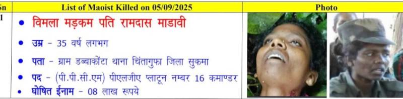 सोढ़ी विमला, प्लाटून नंबर-16 कमांडर (पीपीसी सचिव) निवासी डब्बाकोंटा थाना चिंतागुफ़ा जिला सुकमा, (पिता स्वः सोढी हड़मा, माता -रामे)