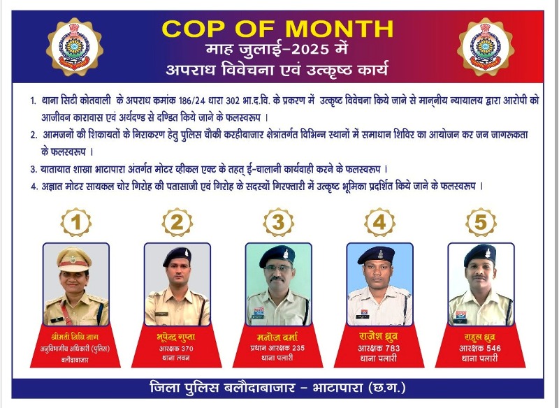 1. श्रीमती निधि नाग एसडीओपी बलौदाबाजार- थाना सिटी कोतवाली के अपराध क्रमांक 328/2024 धारा 302 भादवि एवं 3(2)(V-क) अजा/अजजा अधिनियम के प्रकरण में उत्कृष्ट जांच एवं विवेचना कार्यवाही किए जाने के फलस्वरूप ‘COP OF MONTH’ के रूप में चुना गया है।