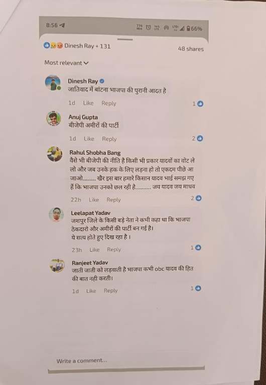 अग्रवाल समाज के प्रमुख पदाधिकारियों ने इस पोस्ट को बेहद आपत्तिजनक बताते हुए कहा कि इससे समाज की मान-प्रतिष्ठा को ठेस पहुंची है। उन्होंने आरोप लगाया कि यह पोस्ट समाज और अन्य जातीय समुदायों (आदिवासी, ओबीसी, यादव, कुम्हार आदि) के बीच नफरत और शत्रुता फैलाने का सुनियोजित प्रयास है। इससे सामाजिक समरसता पर गंभीर असर पड़ सकता है।