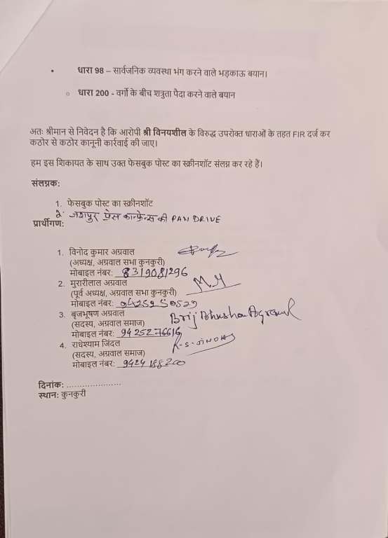 इस संबंध में अग्रवाल समाज की ओर से विनोद कुमार अग्रवाल (अध्यक्ष, अग्रवाल सभा कुन्कुरी), मुरारीलाल अग्रवाल (पूर्व अध्यक्ष), बृजभूषण अग्रवाल (सदस्य) और राधेश्याम जिंदल (सदस्य) ने संयुक्त हस्ताक्षरित लिखित शिकायत थाना प्रभारी को सौंपी। शिकायत में विनयशील के विरूद्ध कड़ी कानूनी कार्रवाई करने की मांग की गई है।