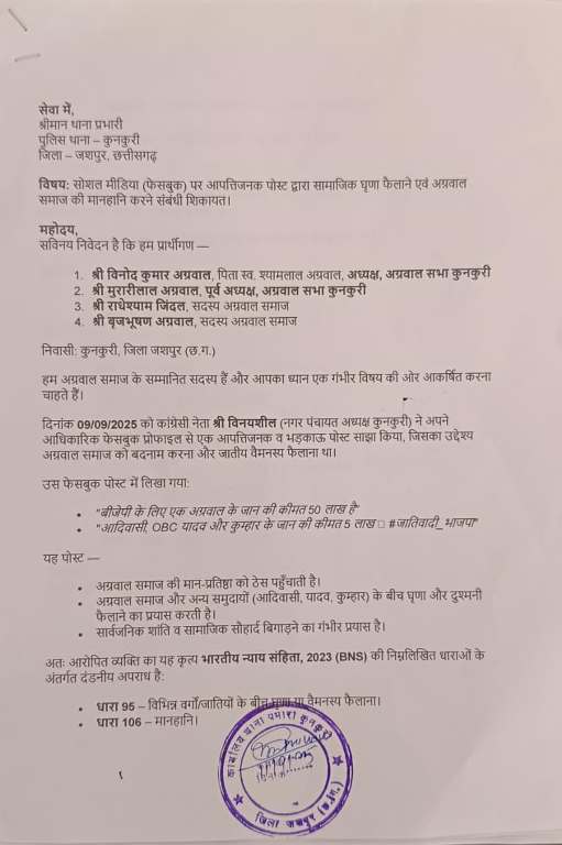 कुनकुरी, 11 सितम्बर 2025: कुनकुरी नगर में सोशल मीडिया पर डाली गई एक फेसबुक पोस्ट को लेकर बड़ा विवाद खड़ा हो गया है। मामला नगर पंचायत अध्यक्ष विनयशील से जुड़ा हुआ है। आरोप है कि उन्होंने अपने अधिकृत फेसबुक अकाउंट से ऐसा भड़काऊ और आपत्तिजनक पोस्ट किया, जिससे विभिन्न समाजों के बीच नफरत फैलाने की कोशिश किये जाने का आरोप अग्रवाल समाज द्वारा लगाया जा रहा है। इसे लेकर अग्रवाल समाज के पदाधिकारियों ने थाना प्रभारी कुन्कुरी को लिखित शिकायत सौंपी है और एफआईआर दर्ज कर वैधानिक कार्यवाही करने की मांग की है।