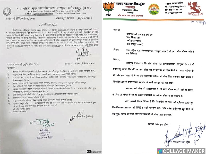 जशपुर. 18 सितंबर 2025 : छत्तीसगढ़ के सरगुजा स्थित संत गहिरा गुरु विश्वविद्यालय ने विद्यार्थियों की समस्याओं को देखते हुए प्रवेश पोर्टल पुनः खोलने का फैसला लिया है। इस निर्णय से उन सैकड़ों छात्रों को राहत मिलेगी, जो इस वर्ष कॉमन यूनिवर्सिटी एंट्रेंस टेस्ट (CUET) में शामिल तो हुए थे, लेकिन समय पर आवेदन न कर पाने के कारण एडमिशन से वंचित रह गए थे। इस महत्वपूर्ण कदम के पीछे नगर पालिका परिषद जशपुर के उपाध्यक्ष युवराज यशप्रताप सिंह जूदेव की संवेदनशील पहल रही, जिन्होंने उच्च शिक्षा मंत्री तक छात्रों की समस्या पहुँचाई और विश्वविद्यालय को राहतकारी कदम उठाने के लिए प्रेरित किया।