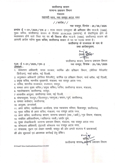 रायपुर, 25 सितम्बर 2025। छत्तीसगढ़ शासन ने राज्य प्रशासनिक सेवा के शीर्ष स्तर पर बड़ा निर्णय लिया है। सामान्य प्रशासन विभाग द्वारा जारी आदेश के अनुसार, वर्तमान मुख्य सचिव श्री अमिताभ जैन (IAS-1989) आगामी 30 सितम्बर 2025 को सेवानिवृत्त हो रहे हैं। उनके सेवानिवृत्त होने के पश्चात राज्य शासन ने श्री विकासशील (IAS-1994) को नया मुख्य सचिव नियुक्त करने का आदेश जारी किया है।