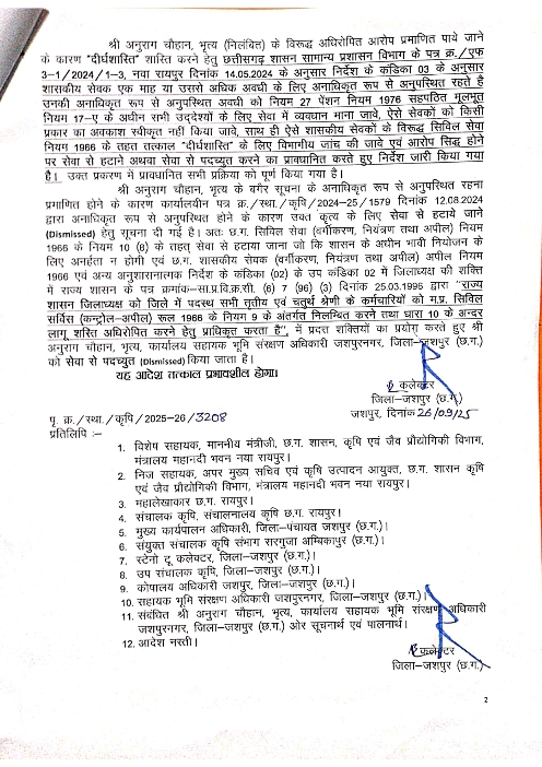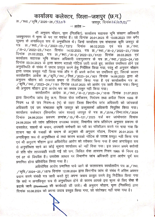 जशपुर, 29 सितंबर 2025/ कलेक्टर रोहित व्यास द्वारा लगभग पाँच माह तक बिना पूर्व सूचना के अनधिकृत अनुपस्थिति पर विभागीय जांच उपरांत नियमानुसार कार्यवाही करते हुए, कार्यालय सहायक भूमि संरक्षण अधिकारी, जशपुरनगर में पदस्थ निलंबित भृत्य श्री अनुराग चौहान की सेवा समाप्त का आदेश जारी कर दिया गया है।
