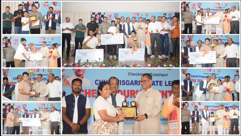 जशपुर : छत्तीसगढ़ रजत महोत्सव अंतर्गत कलेक्टर रोहित व्यास के मार्गदर्शन में जशपुर में आयोजित तीन दिवसीय छत्तीसगढ़ स्टेट लेवल ओपन चेस टूर्नामेंट का सोमवार को सफलतापूर्वक समापन हुआ। इस राज्य स्तरीय स्पर्धा में प्रदेश के 18 जिलों के कुल 204 खिलाड़ियों ने भाग लिया।