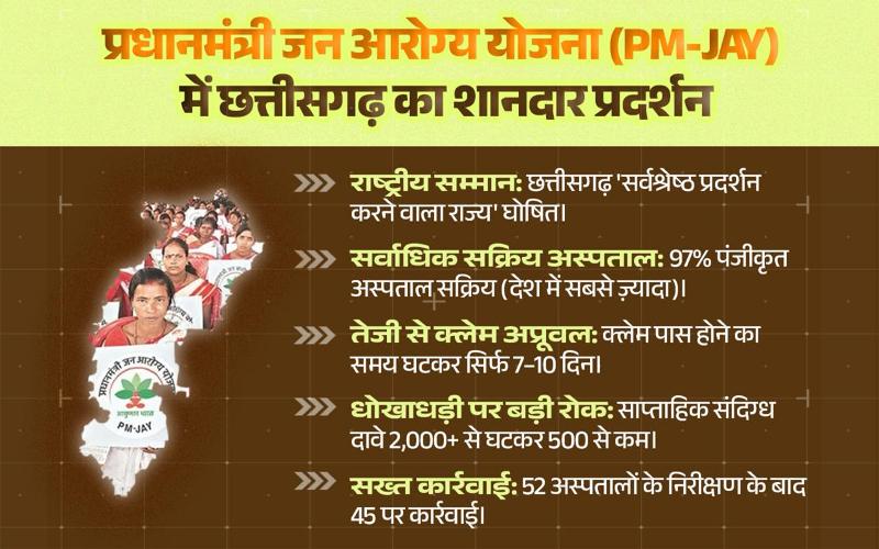राष्ट्रीय स्वास्थ्य प्राधिकरण के आंकड़ों के अनुसार, छत्तीसगढ़ में PM-JAY के तहत पंजीकृत 97% अस्पताल सक्रिय हैं,जो योजना में अस्पतालों के विश्वास का प्रमाण है। जबकि पड़ोसी मध्यप्रदेश में यह दर मात्र 62% और देश का औसत मात्र 52% है।