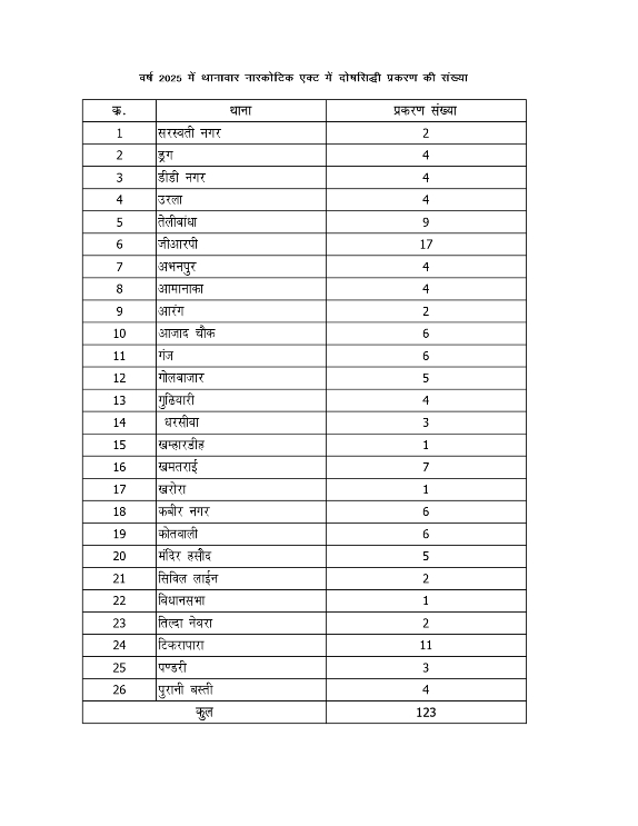 साथ ही माननीय विशेष न्यायालय रायपुर द्वारा 01 जनवरी 2025 से सितम्बर 2025 तक रायपुर के अलग – अलग थानों में दर्ज एनडीपीएस एक्ट के प्रकरणों में कुल 123 आरोपियों को कारावास, सश्रम कारावास एवं अर्थदण्ड की सजा दी गई है।