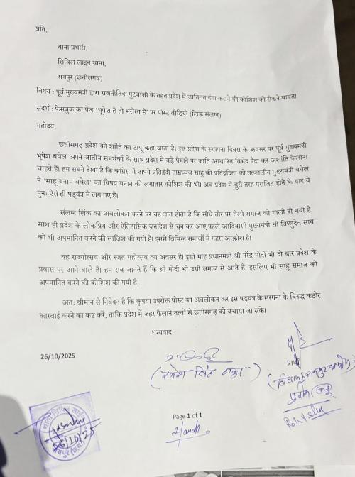 भाजपा प्रतिनिधिमंडल ने अपना आवेदन सौंपकर कहा कि पूर्व मुख्यमंत्री भूपेश बघेल द्वारा राजनीतिक गुटबाजी के तहत प्रदेश में जातिगत विद्वेष और अराजकता फैलाने की कोशिश की जा रही है। इस फेसबुक आईडी में पोस्ट किए गए गाने के जरिए मुख्यमंत्री विष्णुदेव साय एवं साहू समाज को अपमानित करने की साजिश की जा रही है। भाजपा जिला इकाई के पदाधिकारियों द्वारा आवेदन सौंपकर कहा है कि यह पोस्ट घोर आपत्तिजनक है और जातीय व सामाजिक विद्वेष के चलते प्रदेश में अराजकता फैल सकती है।