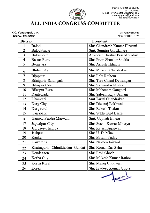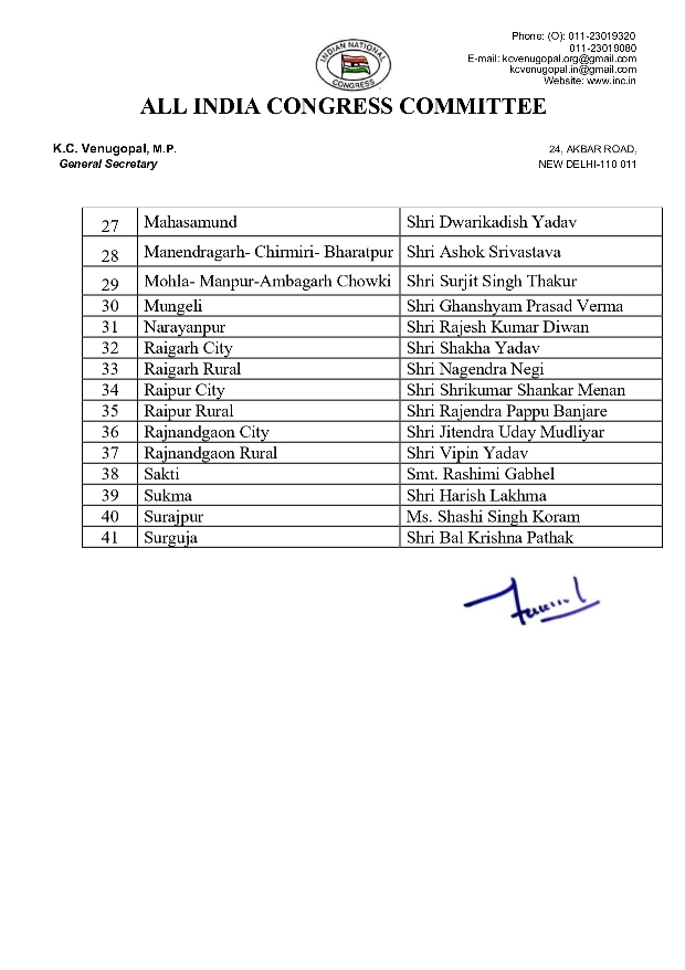 जारी सूची के अनुसार राज्य के 41 जिलों में निम्नलिखित व्यक्तियों को जिला कांग्रेस कमेटी का अध्यक्ष नियुक्त किया गया है—