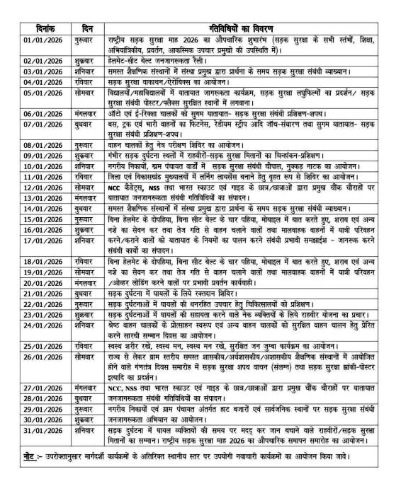 जनसामान्य, सड़क उपयोगकर्ताओं को सड़क सुरक्षा की गंभीरता और चुनौती के संबंध में जागरूकता के लिये छत्तीसगढ़ राज्य के समस्त जिलों सहित सम्पूर्ण भारतवर्ष में दिनांक 1 जनवरी 2026 से 31 जनवरी 2026 तक सड़क सुरक्षा माह 2026 के अंतर्गत सड़क सुरक्षा माह के दौरान जिलों में विभिन्न कार्यक्रमों यथा सड़क सुरक्षा पर प्रशिक्षण कार्यक्रम, स्वास्थ्य परीक्षण, आंखो की जांच, स्कूल दिवस, स्कूली बच्चों को यातायात नियमों के प्रति जागरूक करने स्लोगन, निबंध, चित्रकला, प्रश्नोत्तरी प्रतियोगिता का आयोजन, ई-रिक्शा, ऑटो, बस वाहन चालकों का प्रशिक्षण, गणतंत्र दिवस समारोह में सड़क सुरक्षा पर झॉकी एवं बैनर पोस्टर फ्लैक्स, एम्बुलेंस ड्रायविंग टेªनिंग, वाहनों का फिटनेस, रेडियम स्ट्रीप्स आदि जांच/संधारण, शराब सेवन कर वाहन चालन से नुकसान पर रैली, ग्राम चौपाल में जन जागरूकता, गंभीर सड़क दुर्घटना स्थलों के चिन्हित सड़क सुरक्षा मितानों का प्रशिक्षण, युवाओं के लिये एरोबिक्स जुम्बा के माध्यम से स्वस्थ शरीर रखे स्वस्थ मन, स्वस्थ मन रखे सुरक्षित जन कार्यक्रम, हेलमेट धारी वाहन चालकों को प्रोत्साहन स्वरूप टाफी वितरण सहित स्थानीय परिस्थितियों के अनुरूप विविध कार्यक्रमों सहित संलग्न सूची अनुसार अनेक कार्यक्रमों का आयोजन किया जा रहा है।