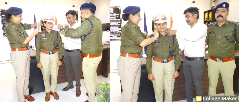 पुलिस अधीक्षक श्रीमति भावना गुप्ता द्वारा कंधे पर अशोक चिन्ह लगाकर अतिरिक्त पुलिस अधीक्षक बनने की दी गई बधाई.