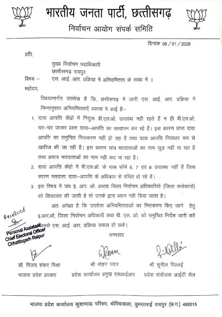 भाजपा प्रदेश प्रवक्ता डॉ. मिश्रा ने बताया कि दावा आपत्ति केंद्रों में नियुक्त बी.एल.ओ. उपलब्ध नहीं रहते हैं और न ही बी.एल.ओ. घर-घर जाकर प्राप्त दावा-आपत्ति का सत्यापन कर रहे हैं। इस कारण प्राप्त दावा आपत्ति का समुचित निराकरण नहीं हो रहा है तथा दावा आपत्ति निराधार रूप से खारिज की जा रही है। इस कारण पात्र मतदाताओं का नाम जुड़ नहीं पा रहा है तथा अपात्र मतदाताओं का नाम नहीं कट पा रहा है। इसी प्रकार दावा आपत्ति केंद्रों में बी.एल.ओ. के पास फॉर्म 6, 7 एवं 8 उपलब्ध नहीं हैं जिससे मतदाता दावा-आपत्ति के अधिकार से वंचित हो रहे हैं। पत्र में बताया गया कि इस विषय में जब ई.आर.ओ. अथवा जिला निर्वाचन अधिकारियों (जिला कलेक्टरों) को शिकायत की जाती है तो उनके द्वारा ध्यान नहीं दिया जाता है। भाजपा नेताओं ने इन अनियमितताओं का निराकरण किए जाने हेतु ई.आर.ओ. जिला निर्वाचन अधिकारी तथा बी. एल. ओ. को समुचित निर्देश जारी करने की मां की है।