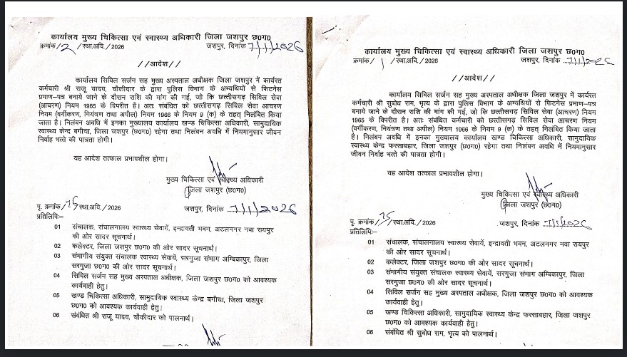 जशपुर : फिटनेस प्रमाण-पत्र के नाम पर अवैध वसूली पर सख्त कार्रवाई, जिला अस्पताल के दो कर्मचारी निलंबित