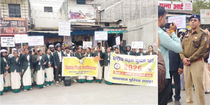 सड़क सुरक्षा माह 2026 के दसवें दिवस यातायात पुलिस रायपुर द्वारा शहर में विभिन्न कार्यक्रमों का आयोजन कर लोगों को यातायात नियमों के प्रति जागरूकता के साथ-साथ नियमों के पालन कर वाहन चलाने के लिए प्रेरित की जा रही है। इसी कड़ी में दिनांक 10 जनवरी को स्काउट गाइड फलोशिप एवं विकास शिक्षा महाविद्यालय रायपुर के छात्र-छात्राओं द्वारा हेलमेट जागरूकता बाईक रैली का आयोजन किया गया। उक्त कार्यक्रम में अतिरिक्त पुलिस अधीक्षक, यातायात रायपुर डॉ. प्रशांत शुक्ला, स्काउट गाइड फेलोशिप छत्तीसगढ़ के अध्यक्ष डॉ. सुरेश शुक्ला, श्री भारती, जिला शिक्षा अधिकारी श्री जी.स्वामी अध्यक्ष बी.एस.जी, श्री अजय तिवारी वरिष्ठ उपाध्यक्ष फेलोशिप, श्रीमती हेमलता साहू, डोलेश्वरी होता, संगीता दुबे, वर्षा अग्रवाल व्याख्याता एवं उमेश साहू के साथ यातायात विभाग से निरीक्षक श्री नवल किशोर कश्यप, थाना प्रभारी यातायात पचपेड़ीनाका एवं अन्य स्टॉफ की उपस्थिति में हेलमेट जागरूकता बाइक रैली को हरी झण्डी दिखा कर रवाना किया गया जो यातायात नियमों से संबंधित बैनर, पोस्टर एवं तख्ती लेकर शहर के प्रमुख मार्गो एवं चौक-चौराहों से होते हुए लोगों को यातायात निमयों का पालन कर वाहन चलाने जागरूक किया गया।