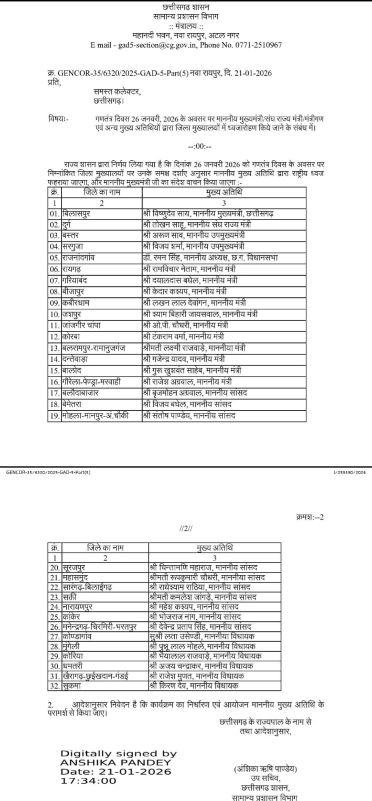 रायपुर : छत्तीसगढ़ शासन के सामान्य प्रशासन विभाग ने गणतंत्र दिवस 26 जनवरी 2026 के अवसर पर राज्यभर में आयोजित होने वाले जिला स्तरीय मुख्य समारोहों के लिए मुख्य अतिथियों की अधिकृत सूची जारी कर दी है। जारी आदेश के अनुसार राज्य के विभिन्न जिलों में मुख्यमंत्री, मंत्री, सांसद एवं विधायक मुख्य अतिथि के रूप में उपस्थित होकर राष्ट्रीय ध्वज फहराएंगे और परेड की सलामी लेंगे। यह आदेश नवा रायपुर अटल नगर से 21 जनवरी 2026 को जारी किया गया है।