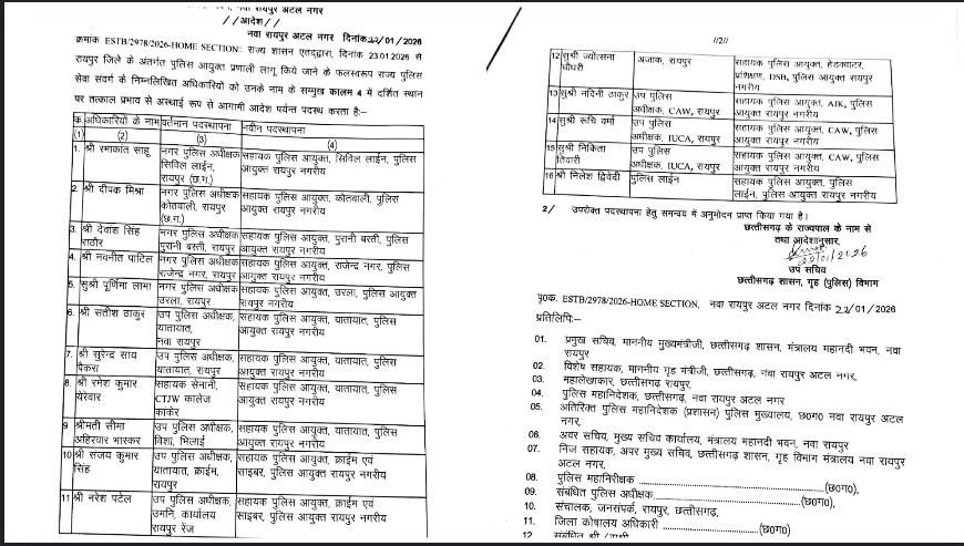 रायपुर : छत्तीसगढ़ शासन के गृह (पुलिस) विभाग द्वारा राजधानी रायपुर में पुलिस आयुक्त प्रणाली लागू किए जाने के बाद प्रशासनिक ढांचे को सुदृढ़ करने की दिशा में एक और बड़ा कदम उठाया गया है। इसी क्रम में 22 जनवरी 2026 को नवा रायपुर अटल नगर स्थित महानदी भवन से आदेश जारी करते हुए राज्य पुलिस सेवा के 16 अधिकारियों की नई पदस्थापना की गई है। यह सभी पदस्थापनाएं तत्काल प्रभाव से आगामी आदेश तक अस्थायी रूप से प्रभावशील रहेंगी।