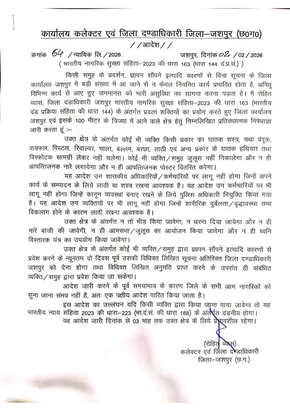 जशपुर : जिला कार्यालय जशपुर में बिना पूर्व सूचना विभिन्न समूहों के अचानक प्रदर्शन, ज्ञापन सौंपने अथवा भीड़ के रूप में पहुंचने से नियमित शासकीय कार्य प्रभावित होने तथा आम नागरिकों को असुविधा होने की स्थिति को देखते हुए कलेक्टर एवं जिला दण्डाधिकारी श्री रोहित व्यास ने भारतीय नागरिक सुरक्षा संहिता–2023 की धारा 163 (पूर्व में दण्ड प्रक्रिया संहिता की धारा 144) के अंतर्गत जिला कार्यालय जशपुर एवं उसके 100 मीटर की परिधि में निषेधाज्ञा लागू करने का आदेश जारी किया है।
