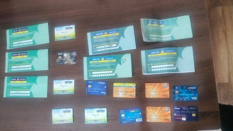 आरोपियों के कब्जे से अलग-अलग बैंकों के 13 नग ए.टी.एम. कार्ड, 07 नग पासबुक किया गया है जप्त.