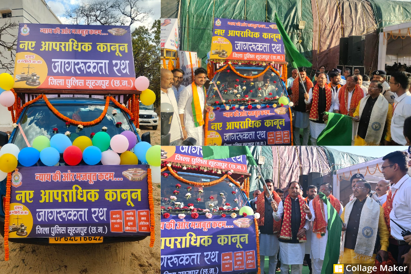 सूरजपुर : छत्तीसगढ़ में कानून और जनजागरूकता को मजबूत बनाने की दिशा में एक अहम पहल की गई है। मुख्यमंत्री श्री विष्णुदेव साय ने सूरजपुर में नए आपराधिक कानूनों और यातायात नियमों की जानकारी को गांव-गांव तक पहुंचाने के लिए विशेष जागरूकता रथों को हरी झंडी दिखाकर रवाना किया। यह पहल आम जनता को सरल भाषा में कानून समझाने और सड़क सुरक्षा के प्रति जागरूक करने का महत्वपूर्ण माध्यम बनेगी।