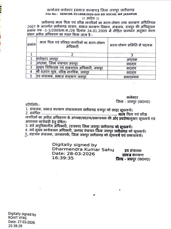 जशपुर : छत्तीसगढ़ माता पिता एवं वरिष्ठ नागरिकों का भरण-पोषण तथा कल्याण अधिनियम 2007 के अंतर्गत् छत्तीसगढ़ शासन, समाज कल्याण विभाग मंत्रालय रायपुर की अधिसूचना में नीहित प्रावधान अनुसार भरण पोषण अपील अधिकारण का गठन किया जाता है।