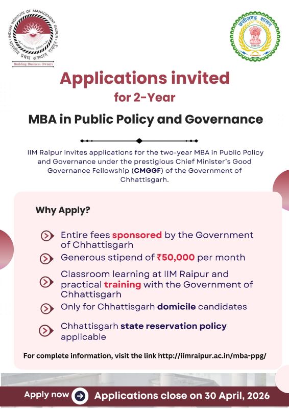 यह कार्यक्रम विशेष रूप से छत्तीसगढ़ के मूल निवासी अभ्यर्थियों के लिए उपलब्ध है तथा इसमें राज्य शासन की आरक्षण नीति लागू होगी। इच्छुक अभ्यर्थी अधिक जानकारी एवं आवेदन हेतु IIM रायपुर की आधिकारिक वेबसाइट पर जाकर निर्धारित तिथि तक आवेदन कर सकते हैं। IIM रायपुर की टीम द्वारा जशपुर के सभी विकास खंडों के कालेज का भ्रमण करके विद्यार्थियों को कोर्स के संबंध में जानकारी दी जा रही है।