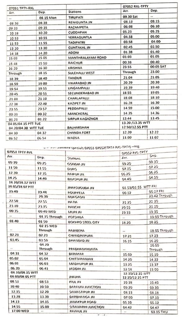 इस गाड़ी का दक्षिण पूर्व मध्य रेलवे में ठहराव की समय सारणी इस प्रकार है :- गाड़ी संख्या 07051 नंम्बर तिरुपति से 08.15 बजे रवाना होकर दूसरे दिन गोंदिया 09.10/09.25 बजे, दुर्ग 11.50/11.55 बजे, रायपुर 12.30/12.35 बजे, बिलासपुर 14.25/14.40 बजे, झारसुगुड़ा 18.05/18.07 बजे, तीसरे दिन रक्सौल 17.00 बजे पहुचेगी । इसी प्रकार विपरीत दिशा में भी गाड़ी संख्या 07052 नम्बर रक्सौल से 03.15 बजे रवाना होकर दूसरे दिन झारसुगुड़ा 01.53/01.55 बजे, बिलासपुर 04.40/04.50 बजे, रायपुर 06.20/06.25 बजे, दुर्ग 07.15/07.20 बजे, गोंदिया 09.20/09.30 बजे, तीसरे दिन तिरुपति 09.30 बजे पहुचेगी ।