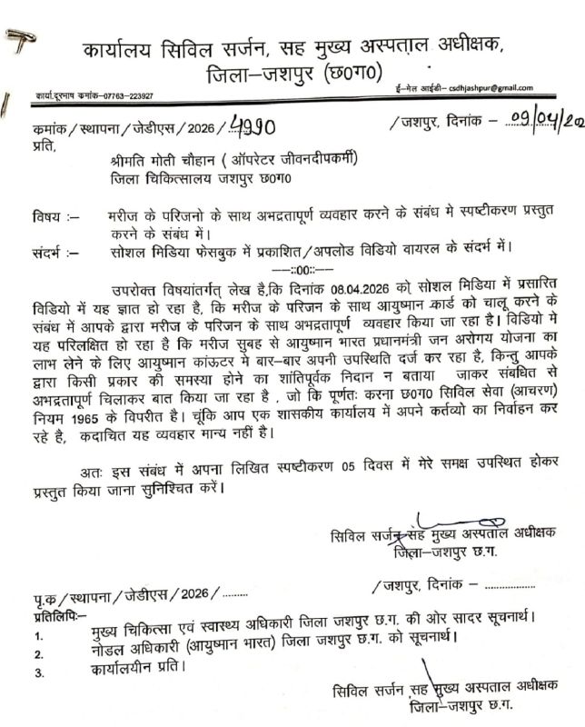 सिविल सर्जन ने नोटिस में उल्लेख किया है कि सोशल मिडिया फेसबुक में प्रकाशित/अपलोड विडियो वायरल के को संज्ञान में लेते हुए दिनांक 08.04.2026 को सोशल मिडिया में प्रसारित विडियो में यह ज्ञात हो रहा है, कि मरीज के परिजन के साथ आयुष्मान कार्ड को चालू करने के संबंध में आपके द्वारा मरीज के परिजन के साथ अभद्रतापूर्ण व्यवहार किया जा रहा है। विडियो मे यह परिलक्षित हो रहा है कि मरीज सुबह से आयुष्मान भारत प्रधानमंत्री जन अरोगय योजना का लाभ लेने के लिए आयुष्मान कांऊटर में बार-बार अपनी उपस्थिति दर्ज कर रहा है, किन्तु आपके द्वारा किसी प्रकार की समस्या होने का शांतिपूर्वक निदान न बताया जाकर संबधित से अभद्रतापूर्ण चिलाकर बात किया जा रहा है जो कि पूर्णतः करना छ०ग० सिविल सेवा (आचरण) नियम 1965 के विपरीत है। चूंकि आप एक शासकीय कार्यालय में अपने कर्तव्यों का निर्वाहन कर रहे है, कदाचित यह व्यवहार मान्य नहीं है।
