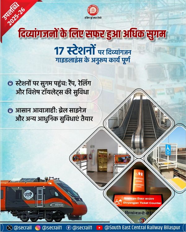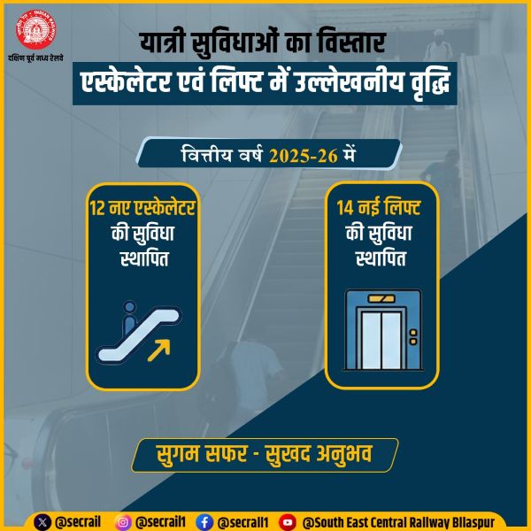 बिलासपुर : दक्षिण पूर्व मध्य रेलवे ने वित्तीय वर्ष 2025-26 के दौरान “यात्री सुविधा सर्वोच्च प्राथमिकता” के सिद्धांत को अपनाते हुए स्टेशनों पर आधारभूत संरचनाओं के सुदृढ़ीकरण एवं आधुनिकीकरण की दिशा में उल्लेखनीय कार्य किए हैं। विशेष रूप से बुजुर्गों, महिलाओं, बच्चों तथा दिव्यांगजनों की सुविधा को केंद्र में रखते हुए विभिन्न यात्री हितकारी पहलें सफलतापूर्वक क्रियान्वित की गई हैं।