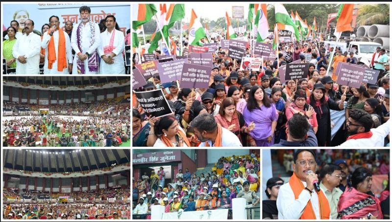 रायपुर : नारी शक्ति वन्दन अधिनियम का विरोध करने वाली कांग्रेस समेत समूचे विपक्ष के खिलाफ प्रदेश की मातृशक्ति ने सोमवार को राजधानी रायपुर में हल्ला बोल कांग्रेस का पुतला दहन किया। भाजपा महिला मोर्चा के नेतृत्व में आज राजधानी रायपुर के इनडोर स्टेडियम से जन आक्रोश पदयात्रा निकाली गई। जन आक्रोश पदयात्रा में हजारों की संख्या में विभिन्न संगठनों से जुड़ीं प्रदेश की हर वर्ग और क्षेत्र से मातृशक्ति जन आक्रोश रैली में शामिल हुई।