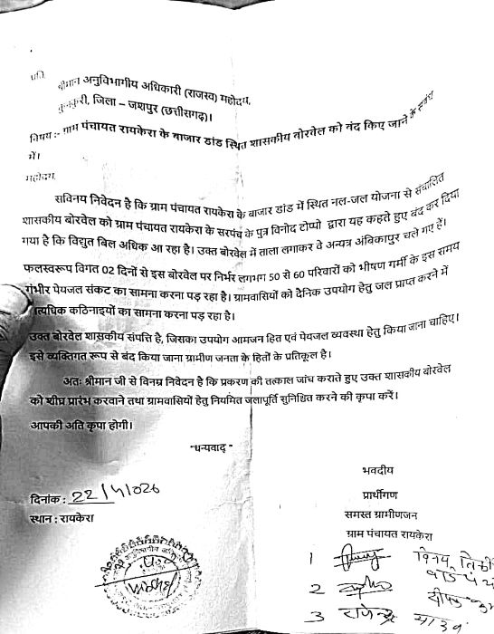 ग्रामीणों द्वारा अनुविभागीय अधिकारी (राजस्व) कुनकुरी को सौंपे गए शिकायत पत्र में दावा किया गया है कि “बिजली बिल ज्यादा आने” का हवाला देकर बोरवेल को बंद कर दिया गया और उसमें ताला लगा दिया गया। इस फैसले ने गांव की जीवनरेखा माने जाने वाले जलस्रोत को अचानक ठप कर दिया, जिससे पिछले दो दिनों से ग्रामीण बूंद-बूंद पानी के लिए भटकने को मजबूर हैं।