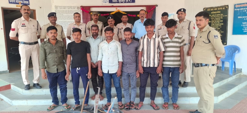 गिरफ्तार आरोपी – (1) नरेन्द्र सिंह उर्फ पण्डा पिता बोधन उम्र 25 वर्ष निवासी कुम्दा बस्ती, थाना विश्रामपुर, (2) रवि उर्फ चरण अगरिया पिता महेश्वर उर्फ महेन्द्र अगरिया उम्र 22 वर्ष ग्राम कसकेला थाना जयनगर, (3) कमलेश सिंह पिता सुखलाल सिंह उम्र 22 वर्ष ग्राम कुम्दा बस्ती, थाना विश्रामपुर, (4) घुरलू उर्फ घुल्डू पैंकरा पिता रामस्वरूप उम्र 25 वर्ष ग्राम माझापारा कसकेला थाना जयनगर, (5) बल्लू सिंह पिता सहदेव सिंह उम्र 28 वर्ष निवासी कुम्दा बस्ती थाना विश्रामपुर, (6) दिनेश सिंह पिता स्व. हीरालाल उम्र 26 वर्ष ग्राम कुम्दा बस्ती थाना विश्रामपुर, (7) धनु पिता बिरबल उम्र 35 वर्ष ग्राम बंशीपुर थाना भटगांव।