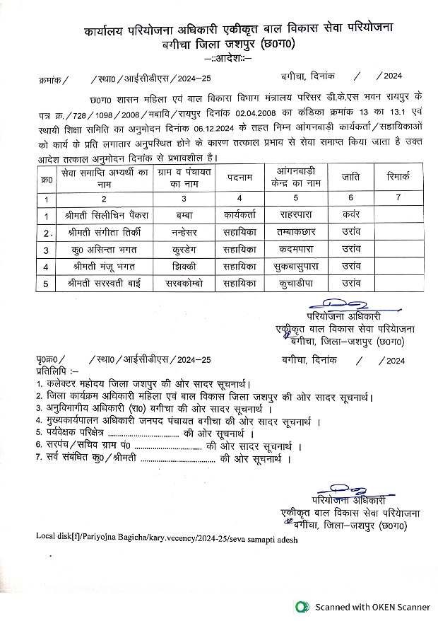 विभाग से प्राप्त जानकारी के अनुसार आंगनबाड़ी कार्यकर्ता और सहायिका लगातार अपने कार्य में अनुपस्थित होने के कारण छत्तीसगढ़ शासन महिला एवं बाल विकास विभाग मंत्रालय परिसर डी. के.एस भवन रायपुर के पत्र द्वारा और स्थायी शिक्षा समिति का अनुमोदन दिनांक 06.12.2024 के तहत निम्न आंगनबाड़ी कार्यकर्ता सहायिकाओं को कार्य के प्रति लगातार अनुपस्थित होने के कारण तत्काल प्रभाव से सेवा समाप्त किया गया है। उक्त आदेश तत्काल अनुमोदन दिनांक से प्रभावशील है। विगत दिवस के साप्ताहिक समय सीमा की बैठक में कलेक्टर रोहित व्यास ने आंगनबाड़ी केंद्र में कसावट लाने के निर्देश दिए थे और समय पर आंगनबाड़ी खोलने के लिए कहा गया था। बगीचा जनपद सीईओ और परियोजना प्रशासक महिला बाल विकास विभाग श्री प्रमोद सिंग ने प्रतिवेदन प्रस्तुत किया गया था।